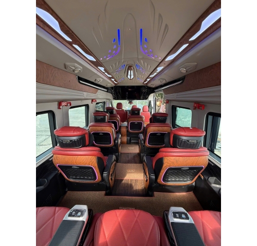 Điểm nhấn chính của xe Limousine 12 chỗ chính là không gian nội thất được thiết kế theo phong cách "phòng khách di động". Ghế ngồi bọc da cao cấp, có chức năng điều chỉnh điện, massage, mang lại sự thoải mái tối đa cho hành khách trên mọi chặng đường. Hệ thống âm thanh, màn hình giải trí sống động, kết nối Wi-Fi tốc độ cao, tủ lạnh mini, và hệ thống đèn LED tạo nên một bầu không khí thư giãn, sang trọng. Các vách ngăn cách âm tinh tế cũng đảm bảo sự riêng tư và yên tĩnh cho hành khách.